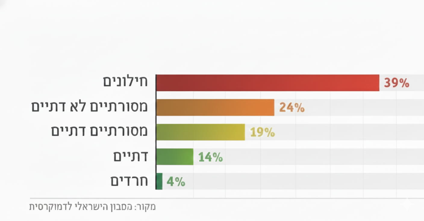 שימו לב למספרים: ה-14% של הציונות הדתית הרבה יותר קרובים ל-3% של חרדים, מאשר ל-39% של חילונים.